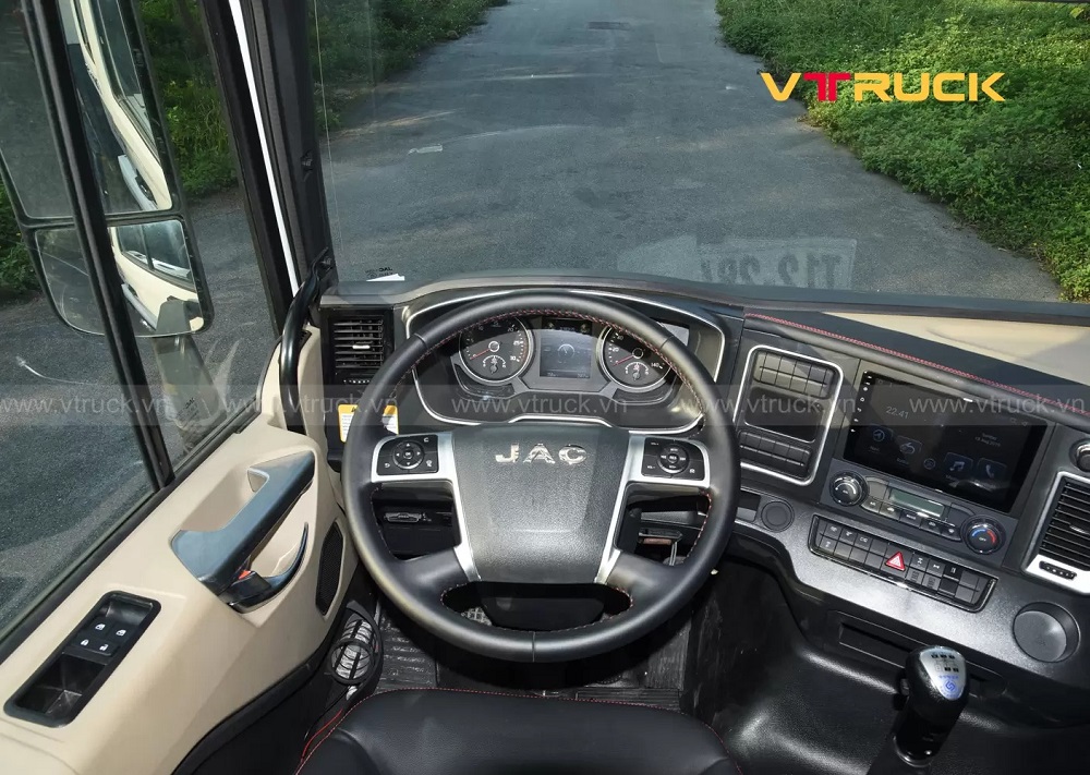Mặt vô lăng và bàn điều khiển có thiết kế hiện đại, sang trọng và đầy tiện nghi. Điểm nhấn là biểu tượng logo JAC được mạ crom vàng nổi bật.
